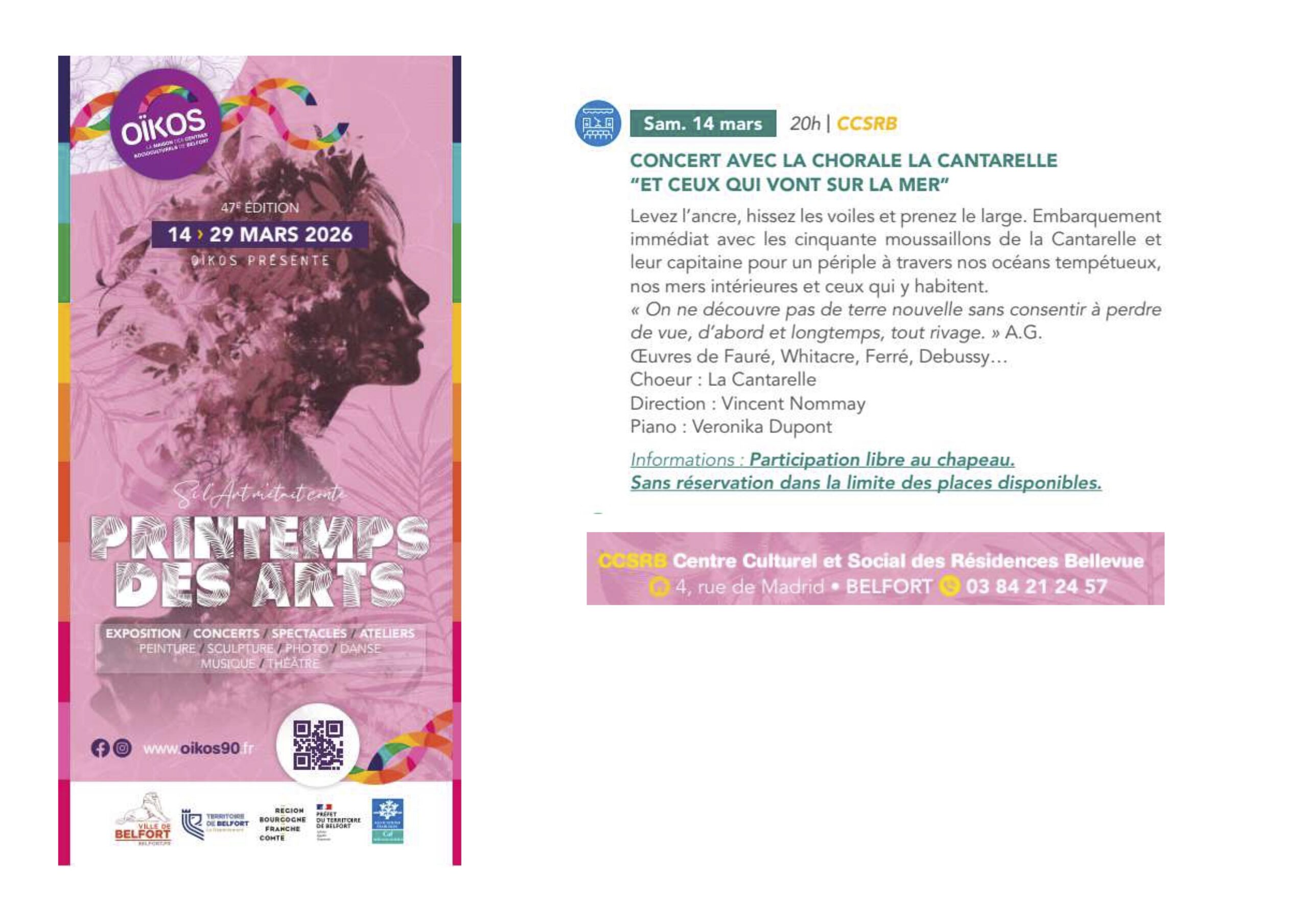 Cette nouvelle année verra le premier concert de l’année de la Cantarelle le 14 mars 2026 à 20h au CCSRB de Belfort, concert intitulé « ET CEUX QUI VONT SUR LA MER ».