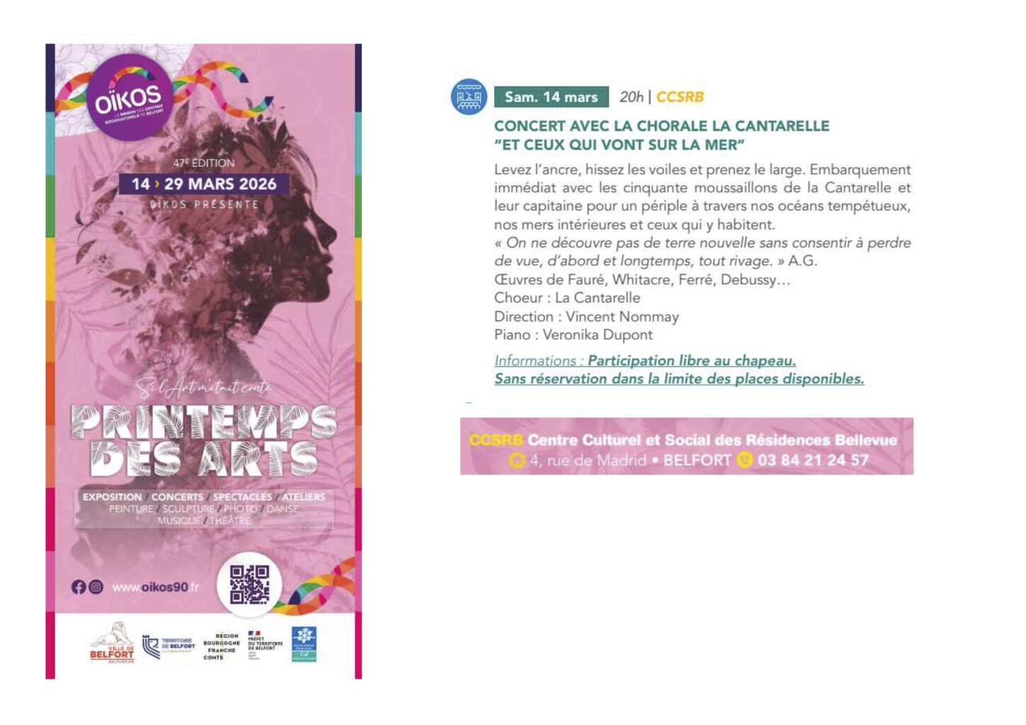 Un premier concert se tiendra le samedi 14 mars 2026 à 20h30, au CCSRB (centre culturel Résidences) de Belfort. Il clôturera la première journée du Printemps des Arts.
